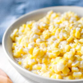 I think this is theย best creamed corn recipe. Theย cheesy cornย in a richย cream sauceย is so delicious and is totalย comfort food! It is one of my family’sย favorite recipes.